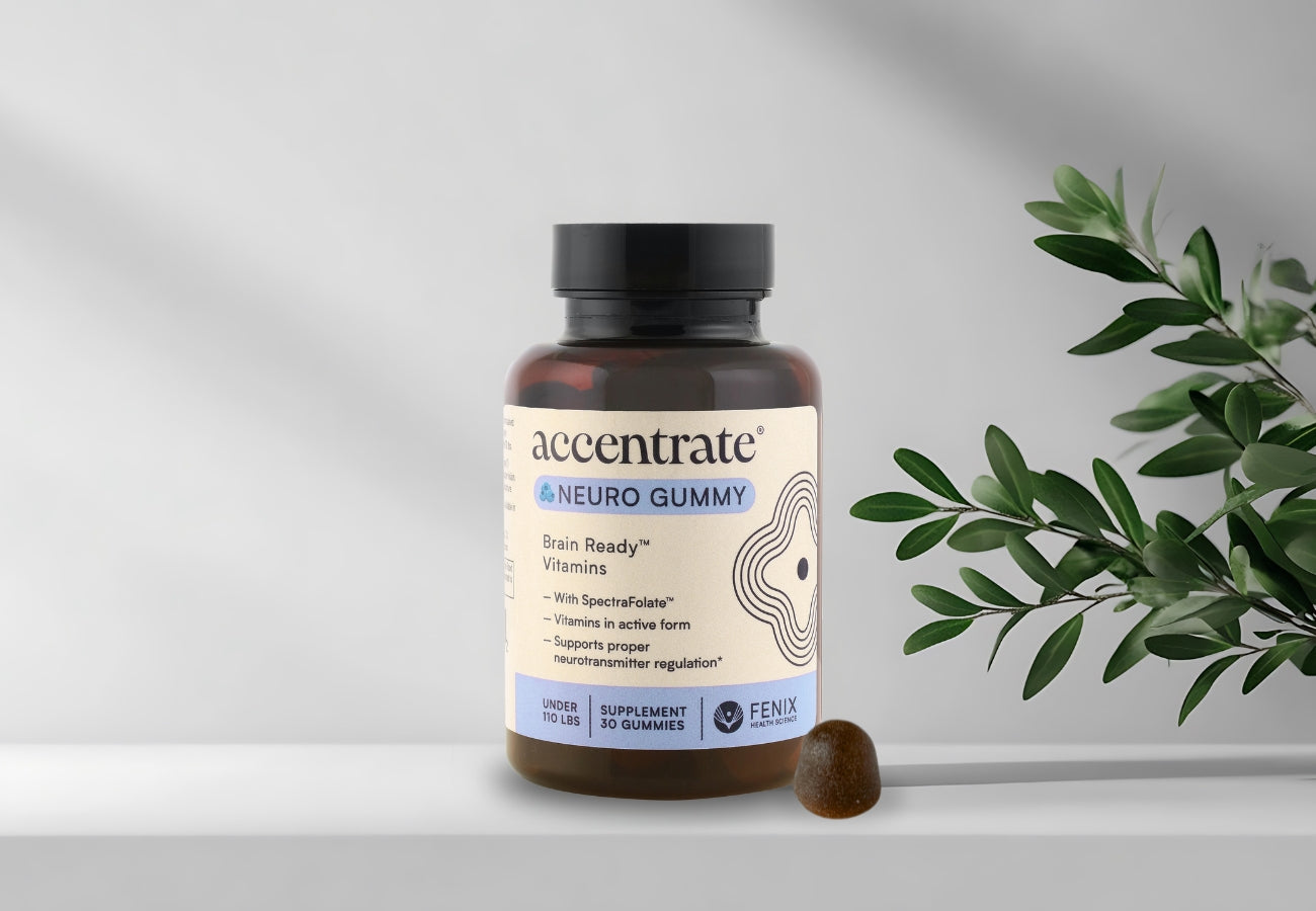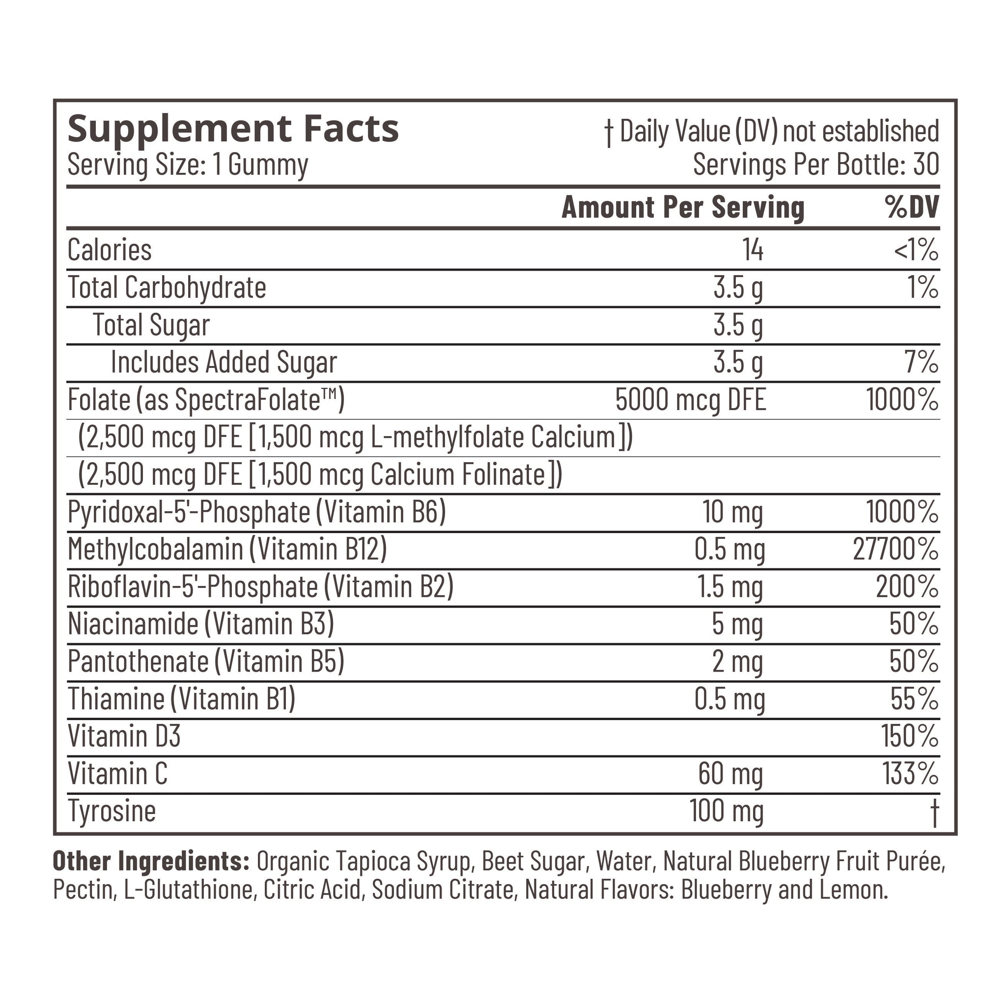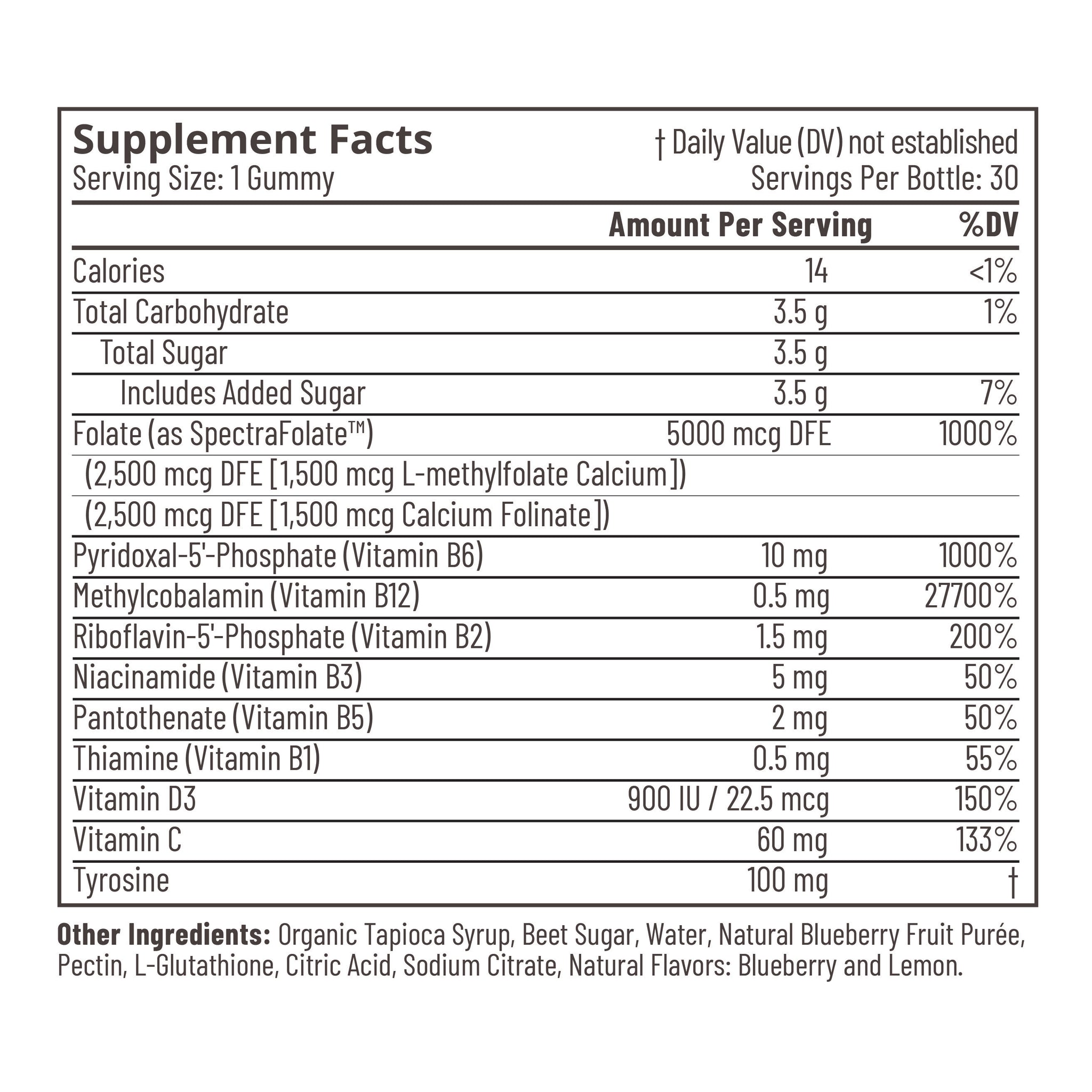 Accentrate® Neuro Gummy is a complete B-complex supplement that supports brain health for kids under 110 lbs. in a great-tasting blueberry lemon gummy. Featuring SpectraFolate™, a blend of L-methylfolate and folinic acid (calcium folinate) for active, bioavailable folate that works with your body’s natural chemistry to support proper folate utilization. It also provides a full spectrum of essential B vitamins—B1, B2, B3, B5, B6, and B12—along with vitamin C, vitamin D, and tyrosine that supports healthy neurotransmitter production.