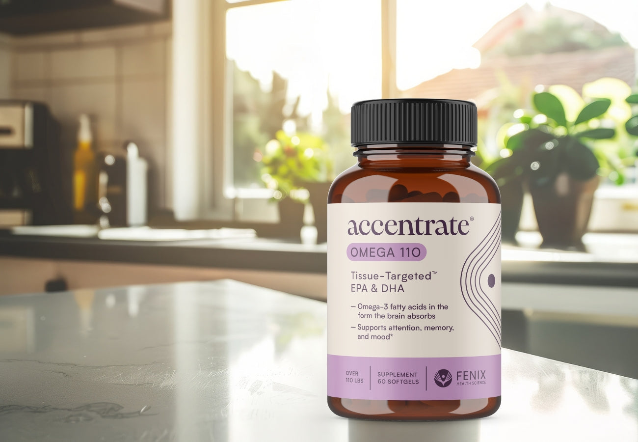 Accentrate® Omega 110 with LYSOVETA® LPC is specifically formulated with the omega-3s, LPC-EPA and LPC-DHA, to support attention, memory, and mood for teens and adults over 110 lbs. It provides Brain Ready™ Nutrition, meaning all ingredients are in the form readily absorbed and used by the brain to support mental health.